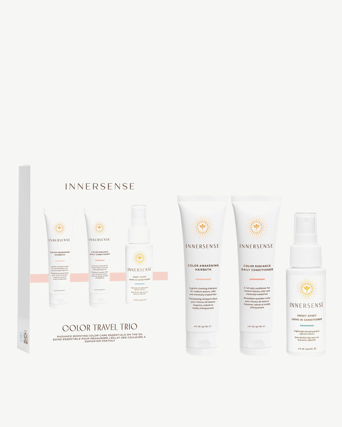 Take your clean beauty on the go with this trio that keeps hair color looking vibrant. Color Awakening Hairbath is a sulfate free (SLS/SLES) shampoo that gently cleanses color processed or medium textured hair while preserving vibrance and boosting radiance. Color Radiance Daily Conditioner moisturizes, repairs and protects to prevent hair color from dulling due to environmental stressors. Sweet Spirit Leave In Conditioner makes detangling a breeze and keeps hair soft and hydrated throughout the day.