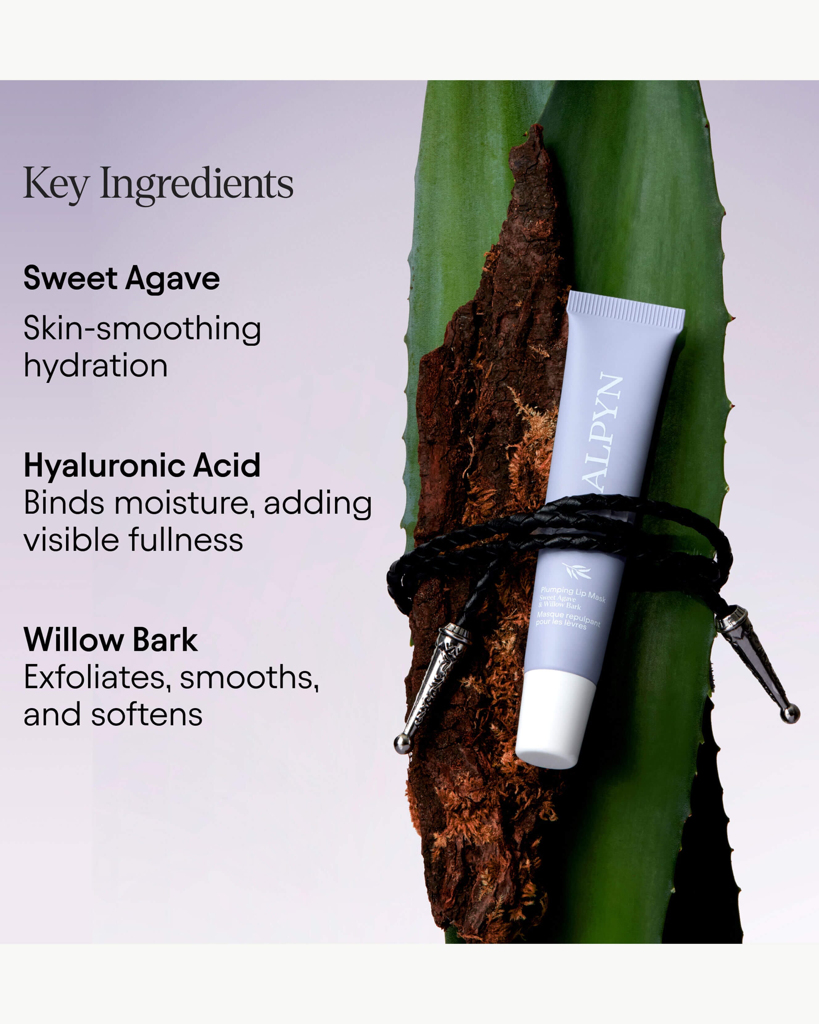 Feeling tight-lipped? This silky, hydrating daily mask is at your service. Hyaluronic acid and sweet agave extract bind moisture for increased hydration, white willow bark (nature’s salicylic acid) gently softens any roughness, and wild chokecherry and vitamin E contain antioxidants. Lips are left looking fuller, softer, smoother, and more supple.